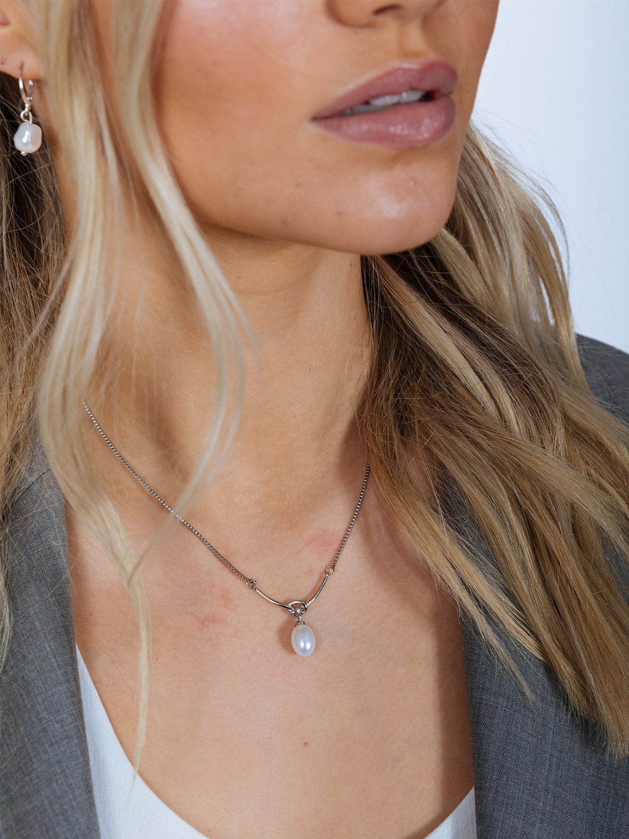 Baroque Oval Pearl Necklace in Silver. A stunning blend of elegance and individuality, this necklace features exquisite baroque pearls on a sleek silver chain. The unique shapes of the pearls highlight their natural beauty, making this piece a timeless accessory for any occasion.