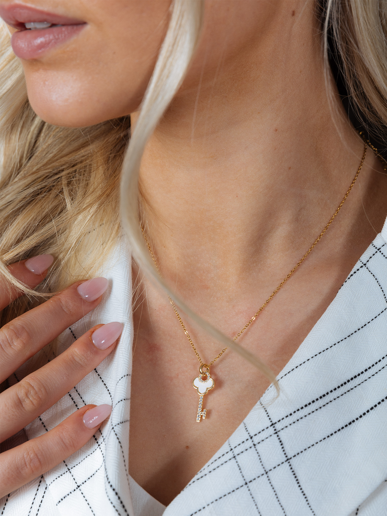 Add a touch of elegance to your jewelry collection with the Key Diamante Pendant Necklace. Featuring a stunning nude stone clover detail, this unique piece is the perfect accessory for any occasion.