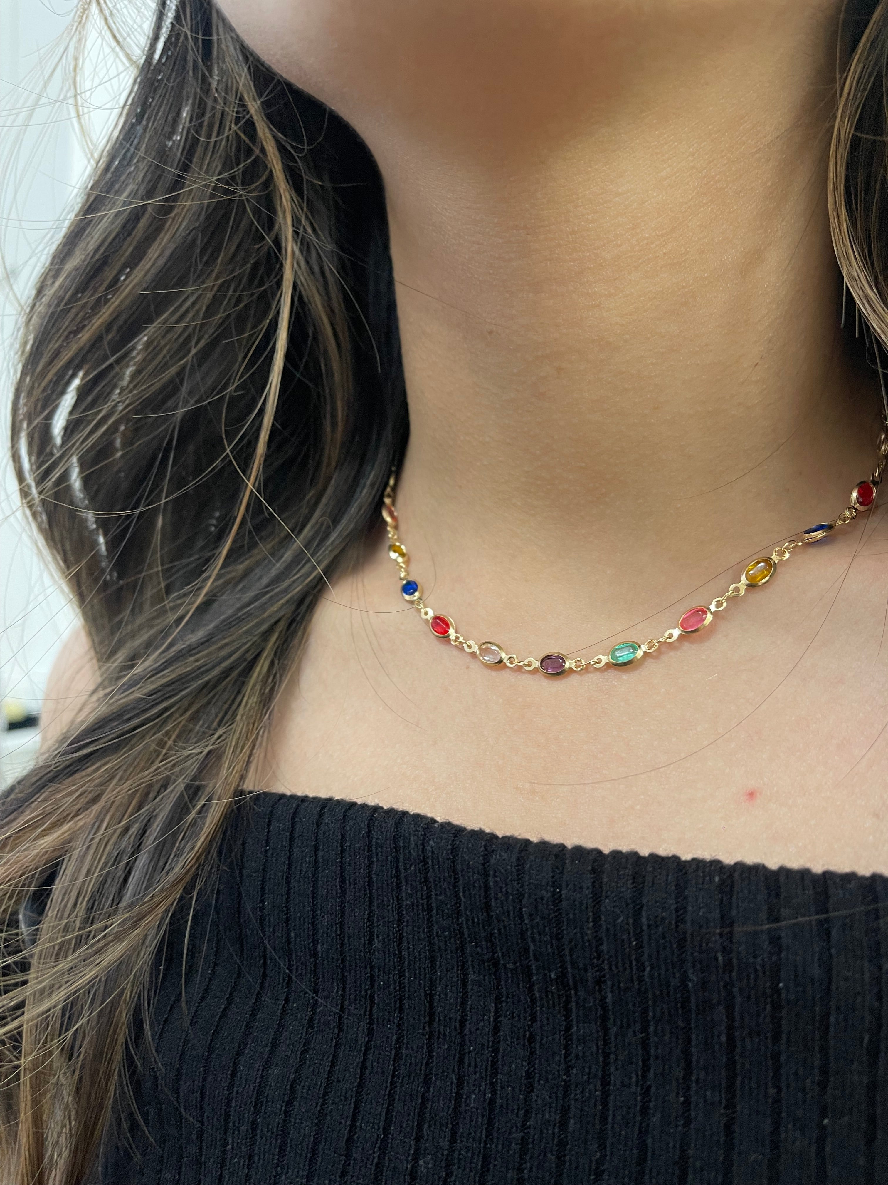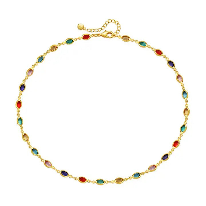 Multicolour Oval Chain Necklace. A stunning statement piece featuring interlinked oval-shaped crystals in a dazzling array of colors. Perfect for adding a pop of brightness to any outfit, this necklace combines elegance with a bold, modern aesthetic.