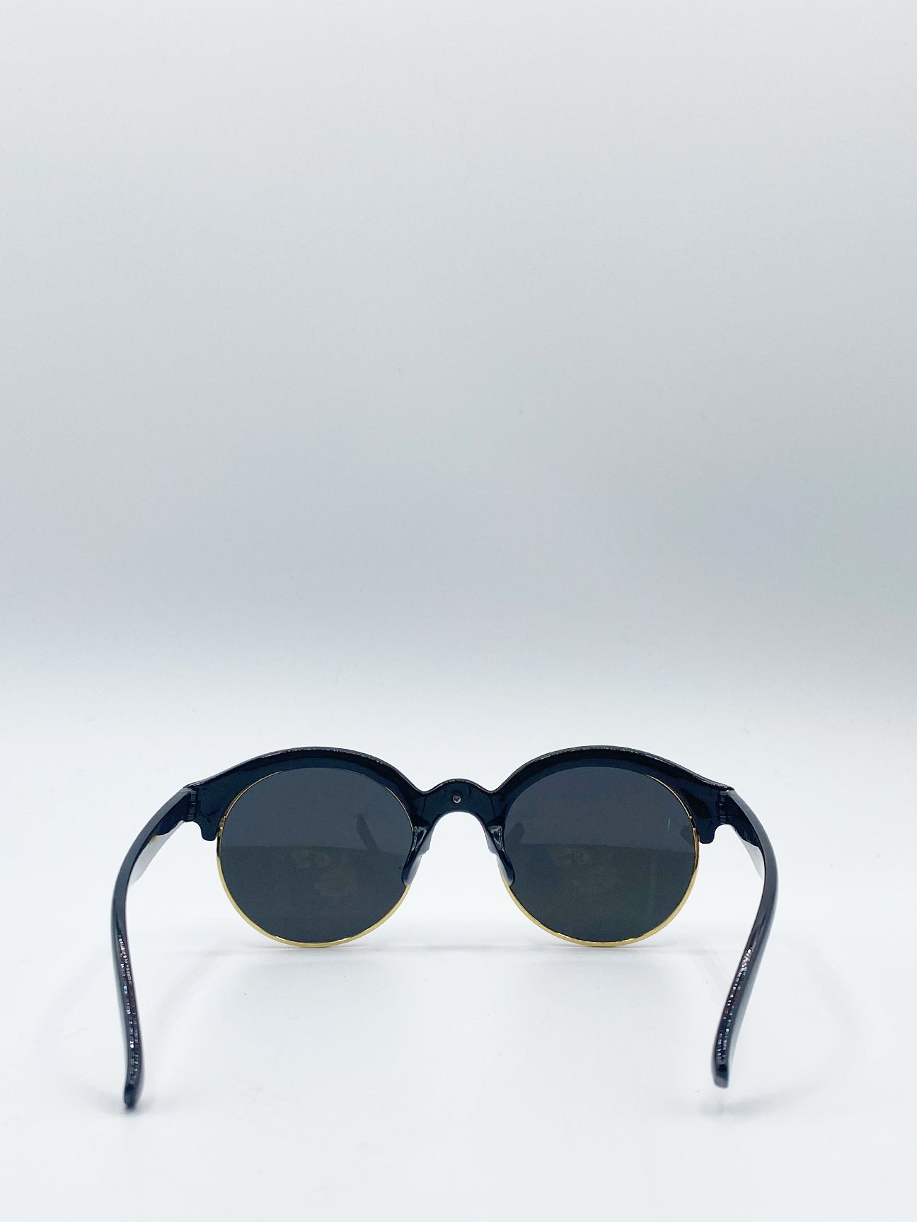Black Round Sunglasses with Blue Revo Lenses and Gold Detail