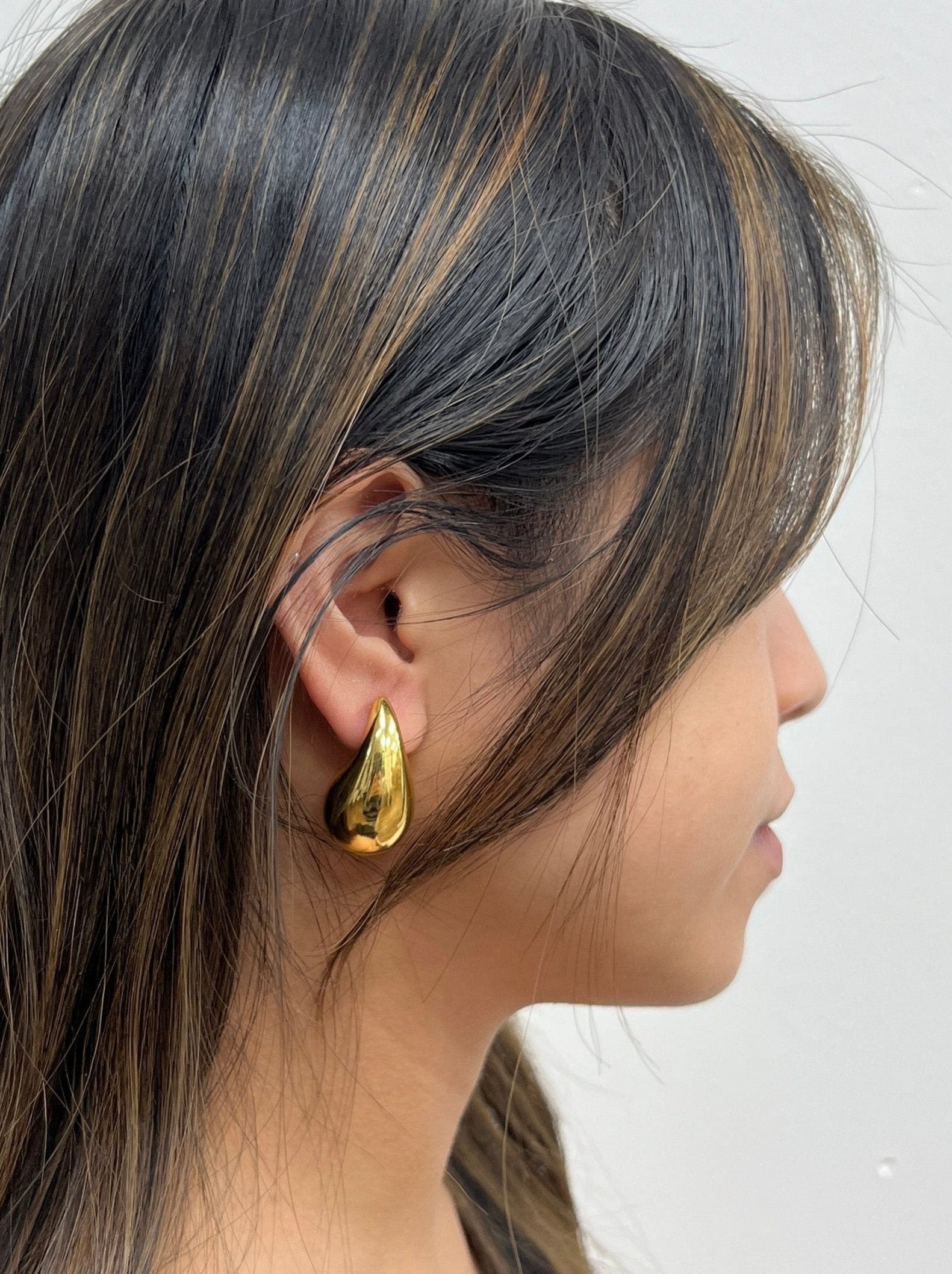 Chunky Waterdrop Earring in Gold. Featuring a mirrored, unique design. Perfect for making a bold statement, these earrings effortlessly elevate casual day outfits or add a touch of sophistication to any look.