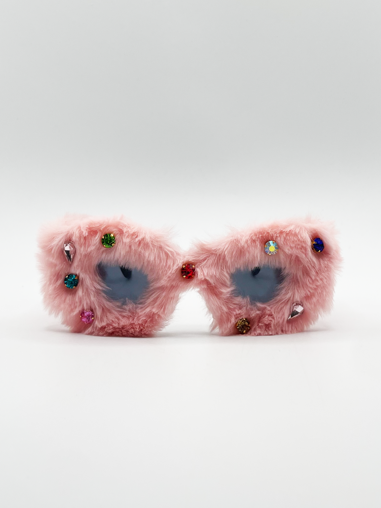 Faux fur Cateye Sunglasses with multicoloured Gems in Pink