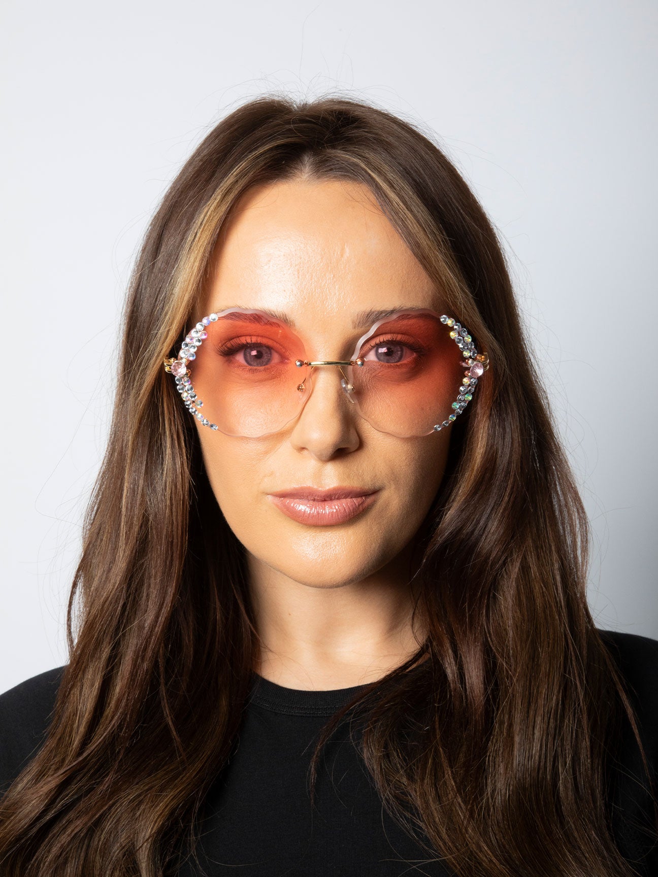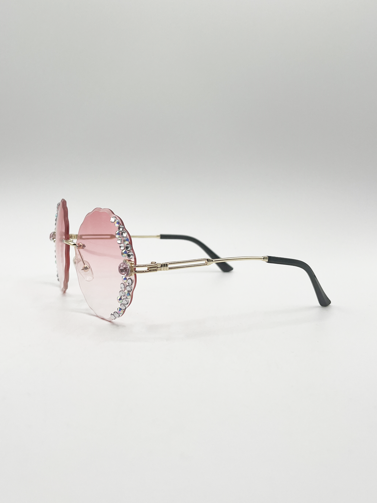 Oversized Round Frameless Sunglasses with Crystal Detail in Pink