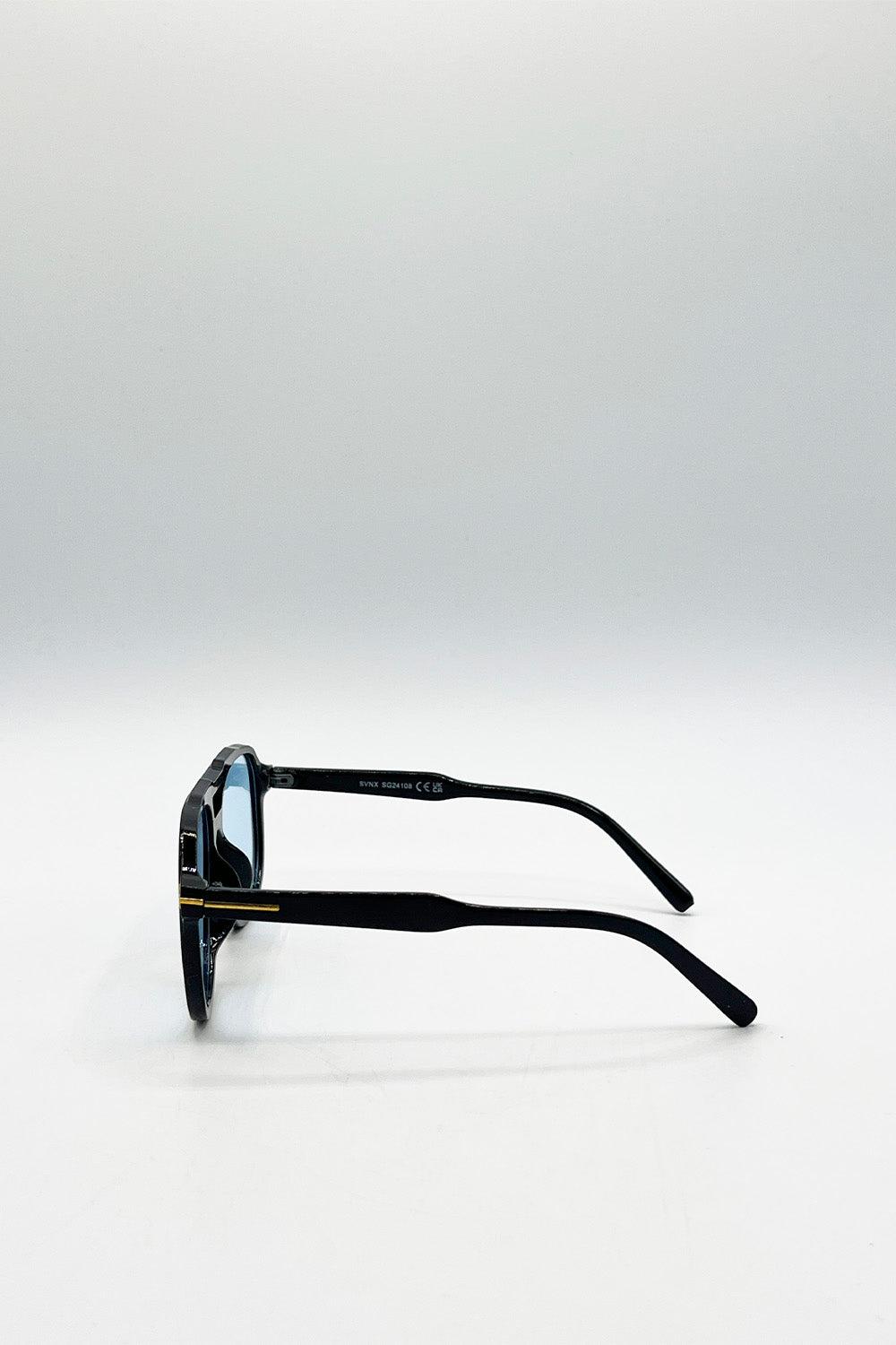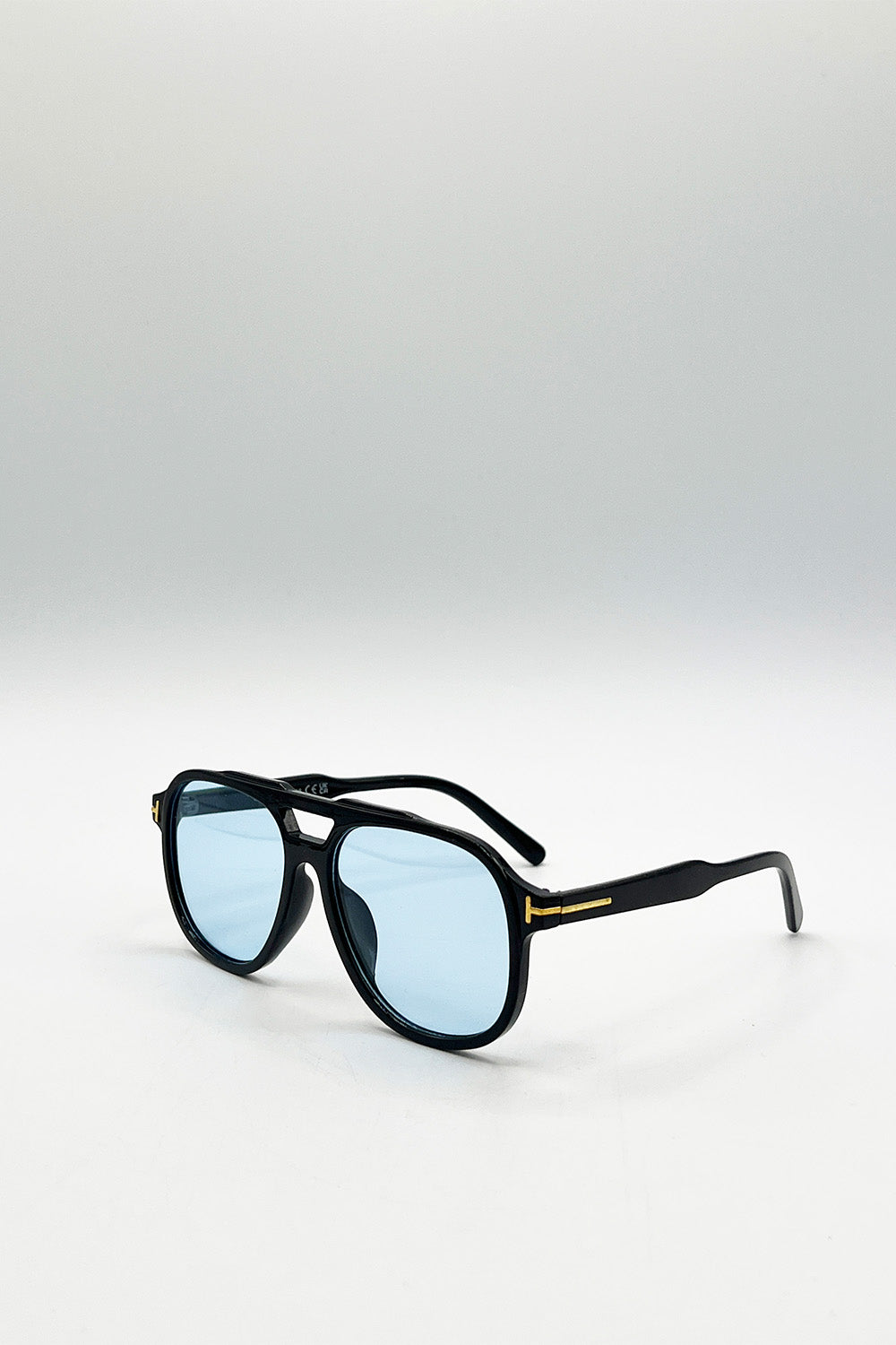Oversized Navigator Sunglasses in Black with Blue Lenses
