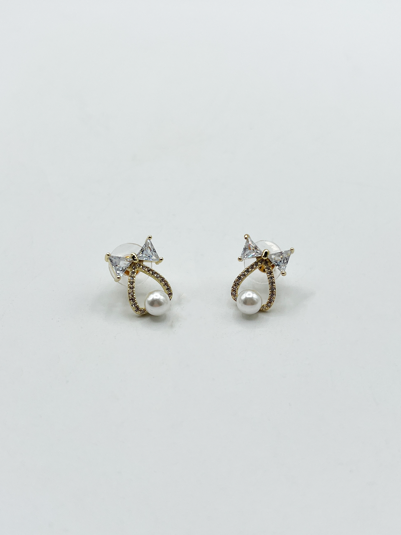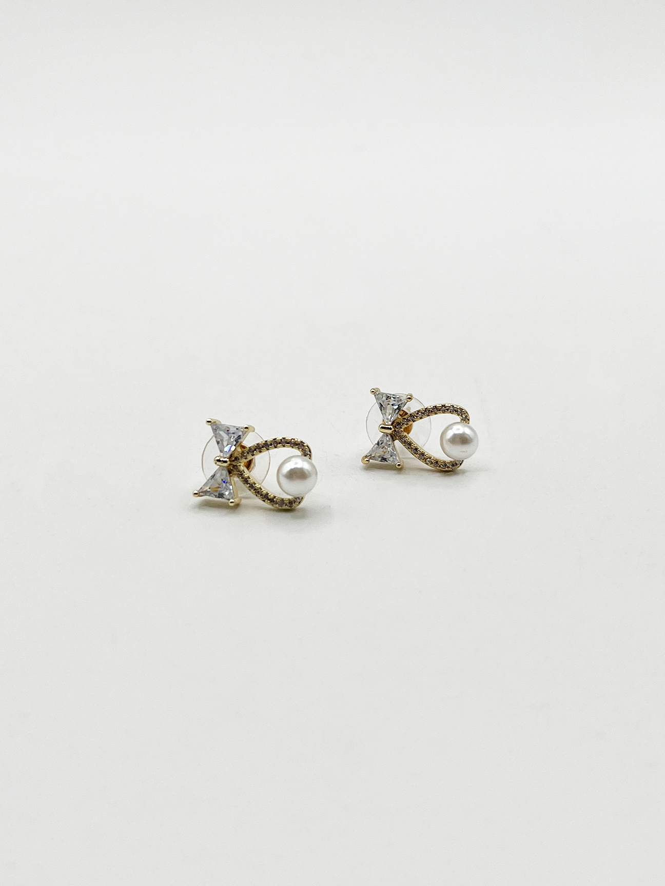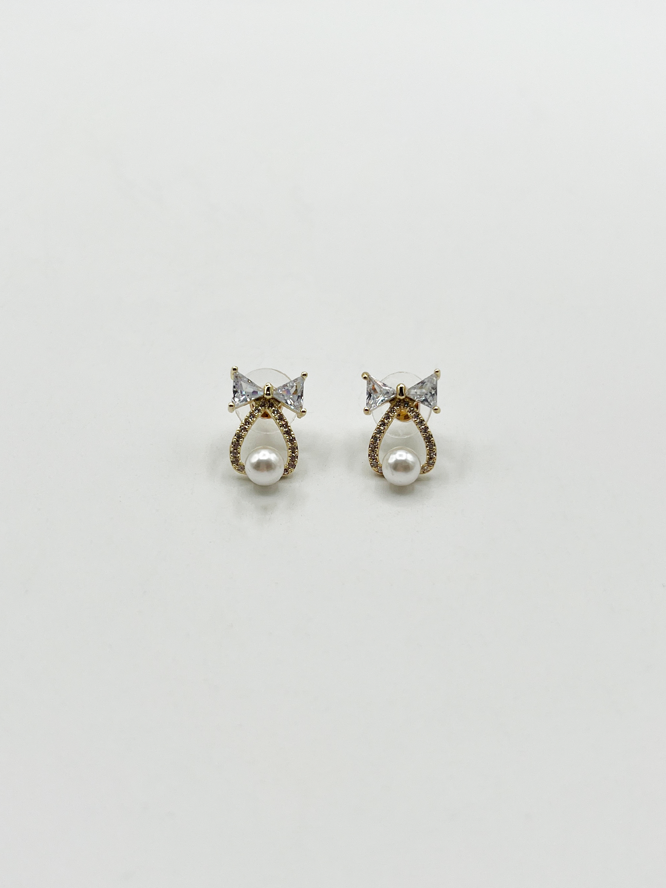 - Studded Bow Earrings with Hanging Pearl in Gold