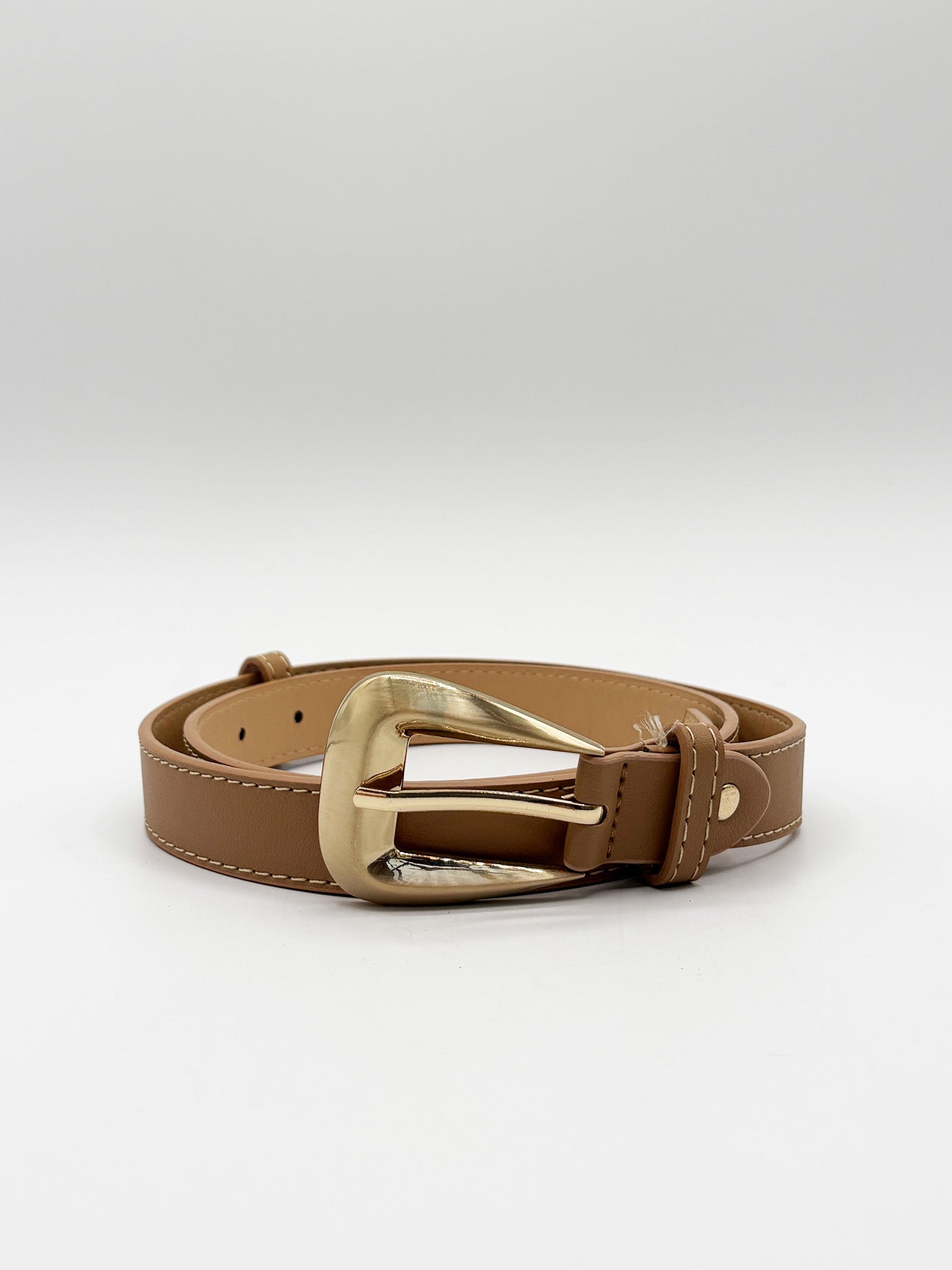 A stylish and versatile accessory, this beige belt features a chic gold metal buckle. Perfect for adding a refined touch to any outfit, whether casual or dressy.
