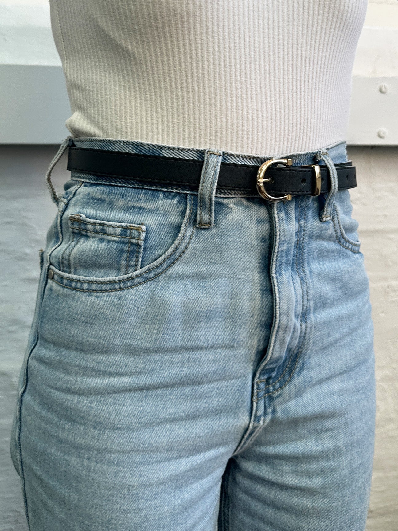 A classic and sleek accessory, this black belt features a sophisticated gold metal buckle. Perfect for adding a polished touch to both casual and formal outfits.