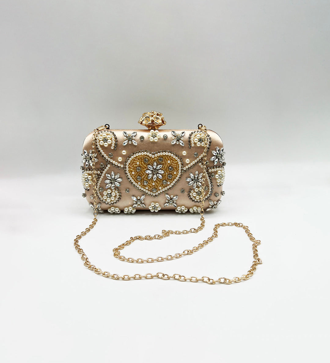 Heart Pearl Clutch Bag In Gold