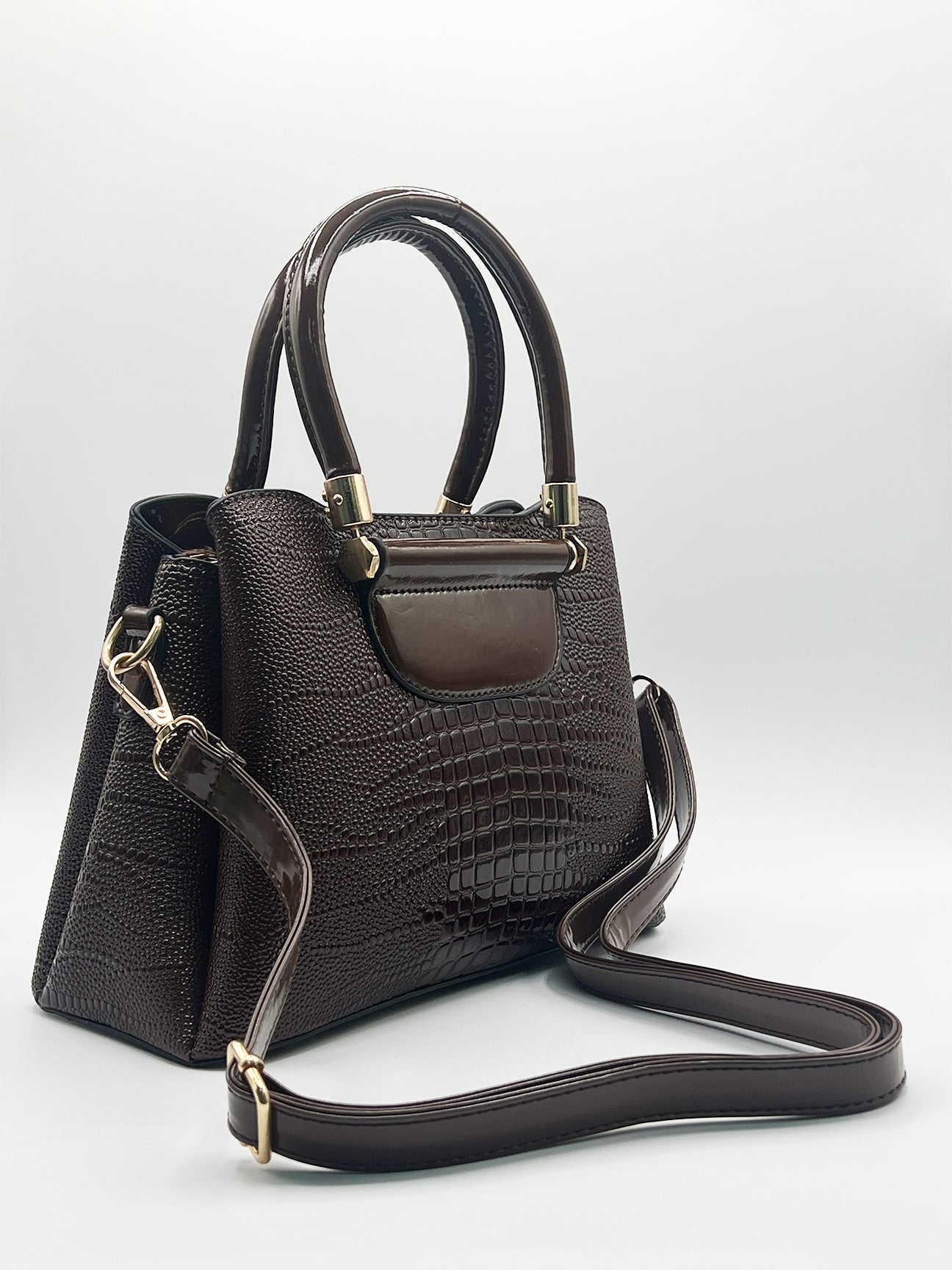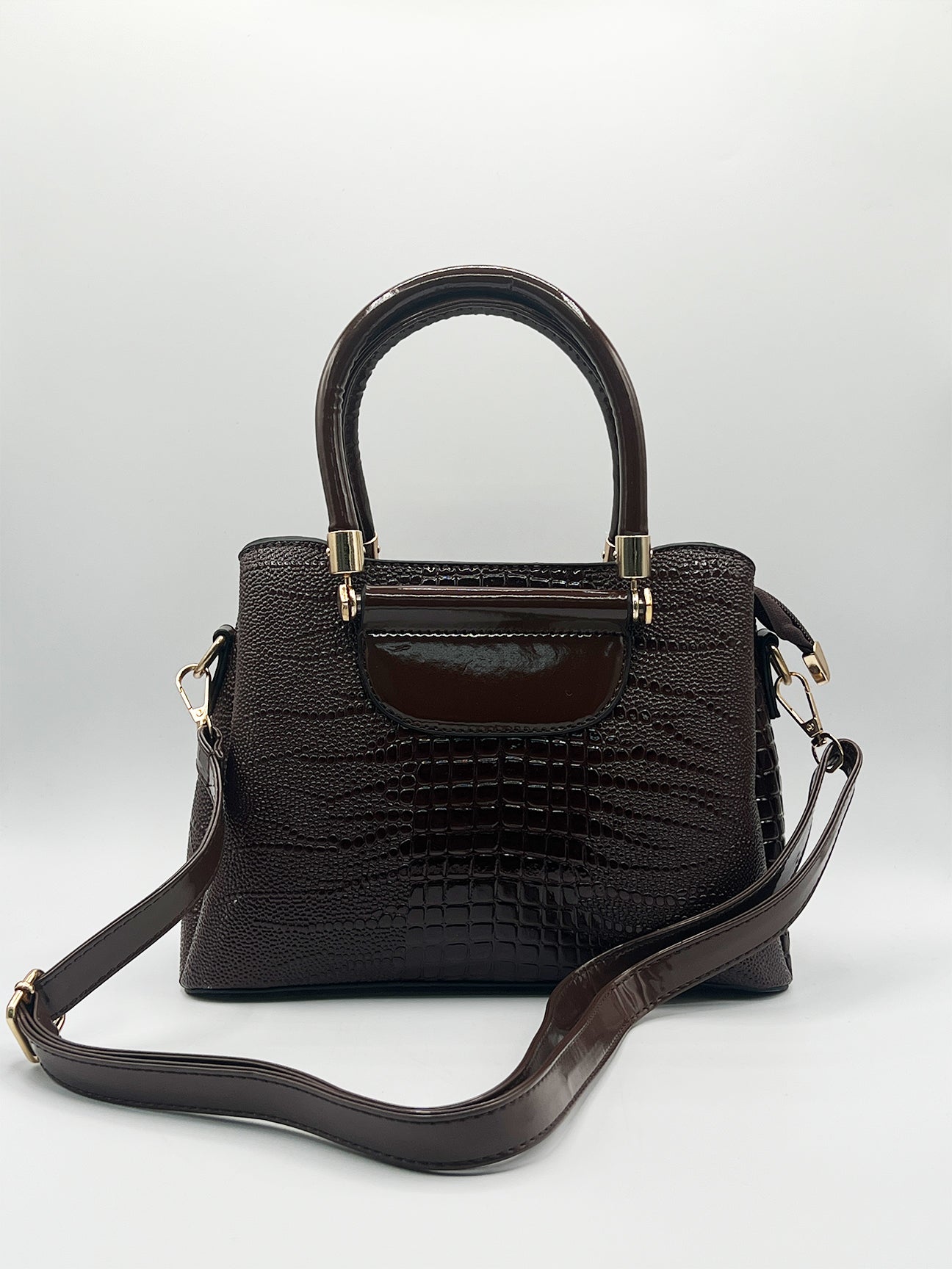 Stay stylish prepared for the season with this chic, patent croc bag. The perfect medium-sized bag for everyday errands, it features multiple compartments for easy organisation. With a versatile top handle and a crossbody strap, this bag effortlessly transitions from day to evening. The rich gradient brown hue makes it easy to pair with any outfit.