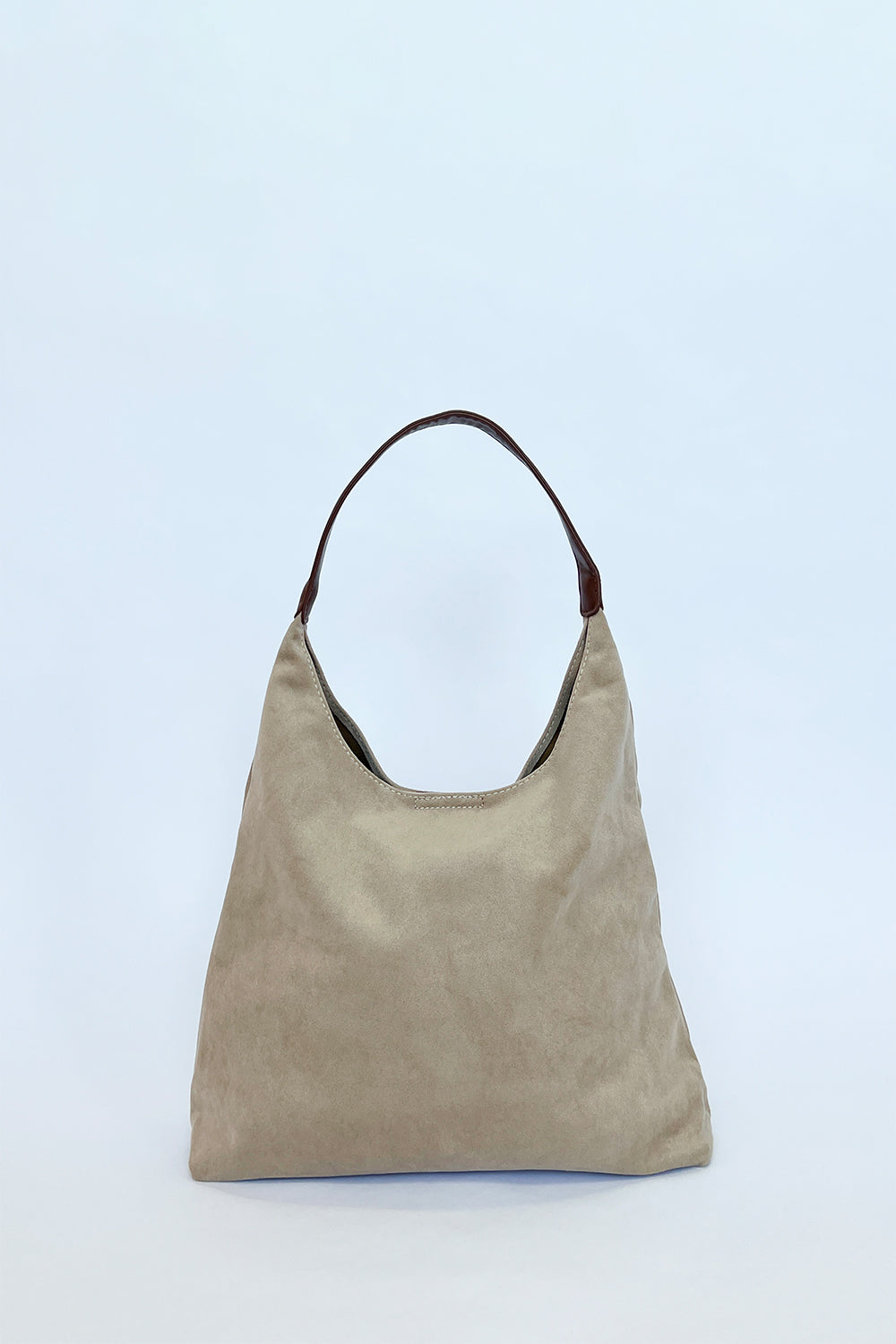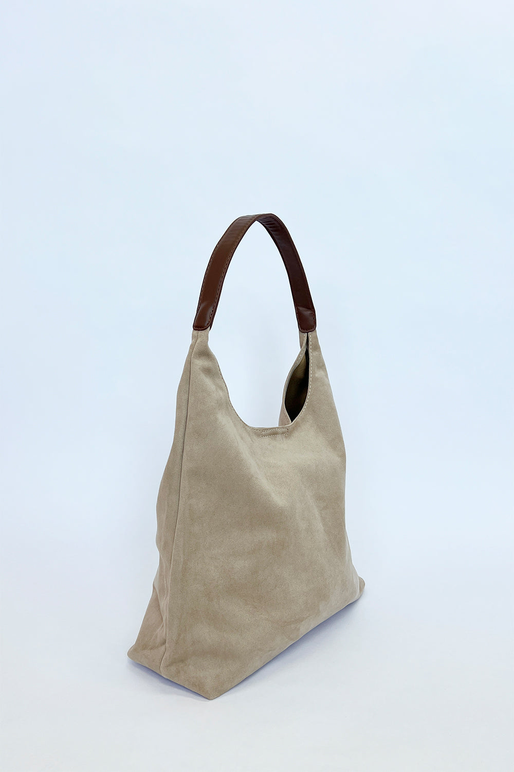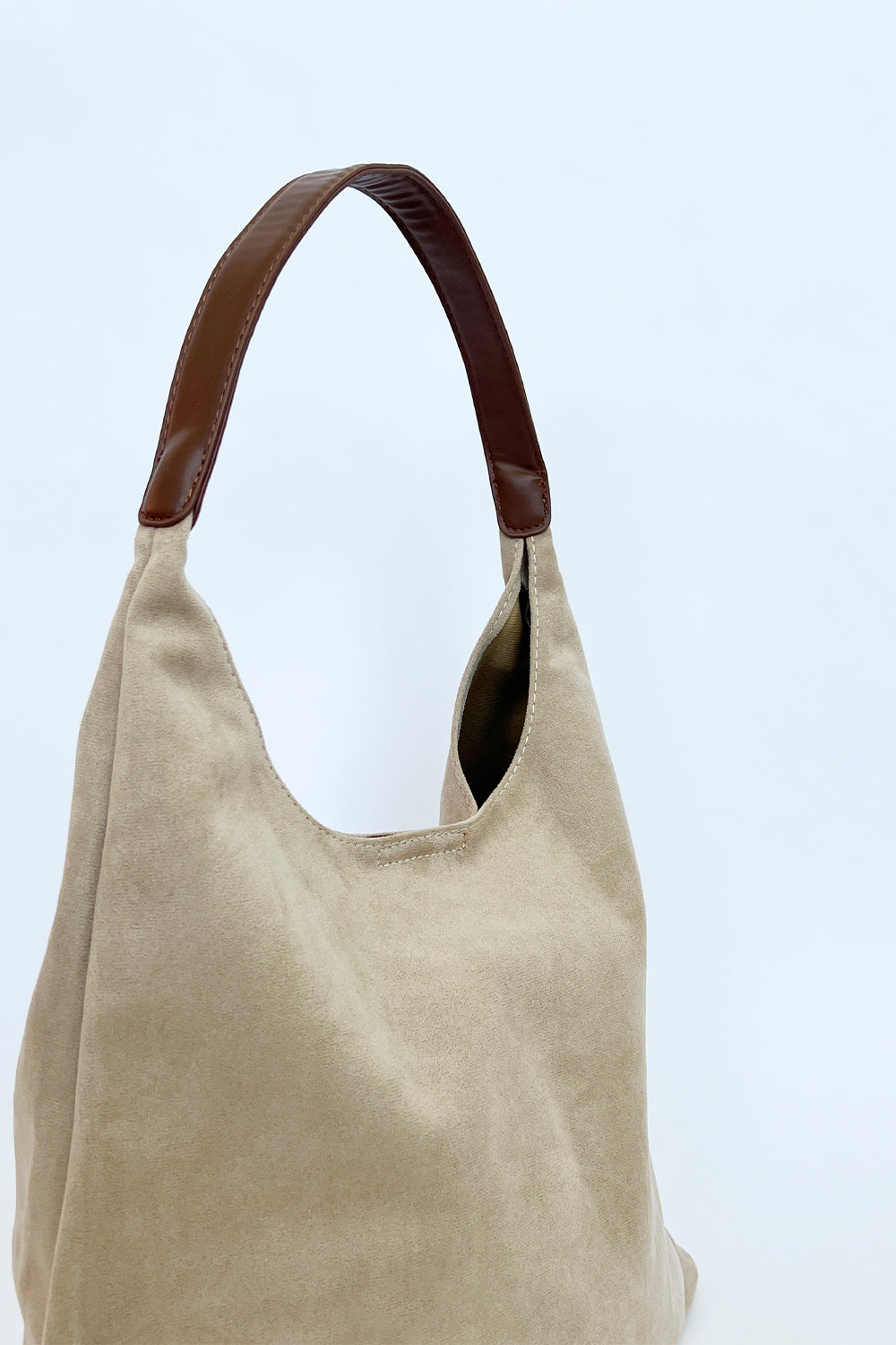 Suede Hobo Shoulder Bag in Beige. A chic and versatile accessory, this Khaki suede hobo bag offers a spacious design and a relaxed, slouchy silhouette. Perfect for everyday use, it combines both style and functionality with a soft, luxurious feel.