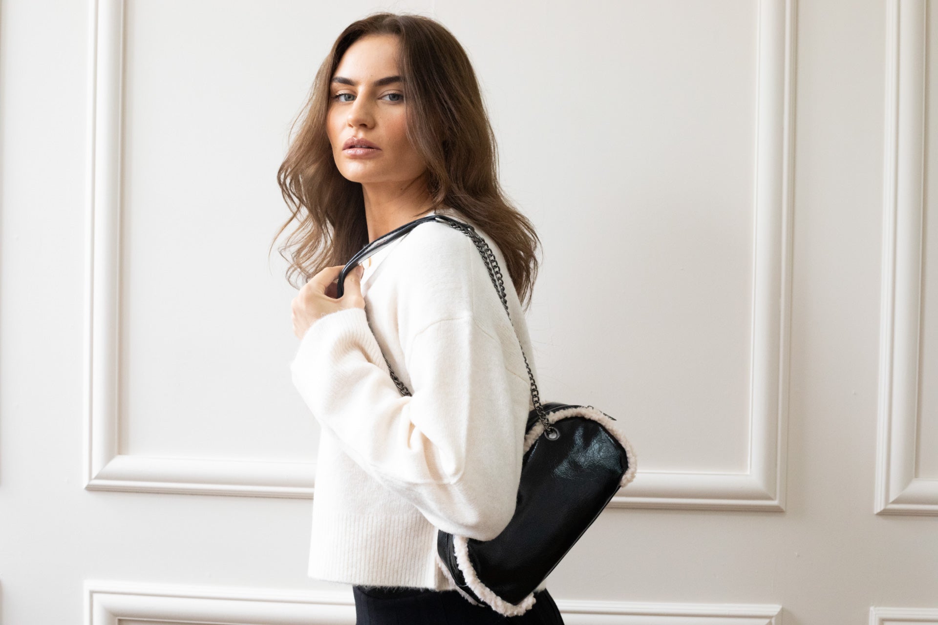 Elevate your wardrobe with the Patent Shoulder Bag with Borg Fur Trim by SVNX. This trendy piece features a sleek patent finish, chain strap detail, and luxurious borg fur trim. Its stylish and unique design effortlessly enhances all your seasonal outfits, adding a touch of sophistication and warmth.