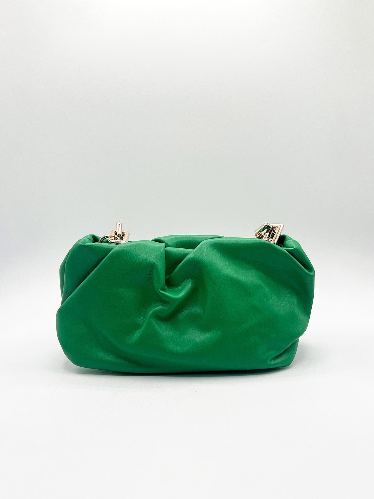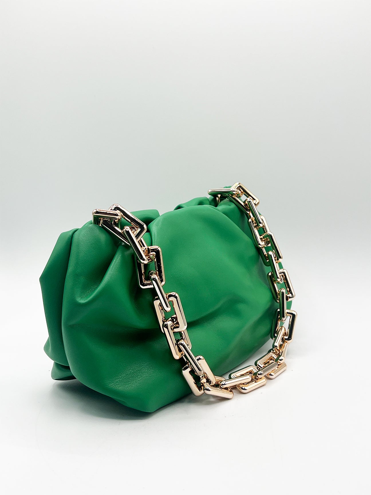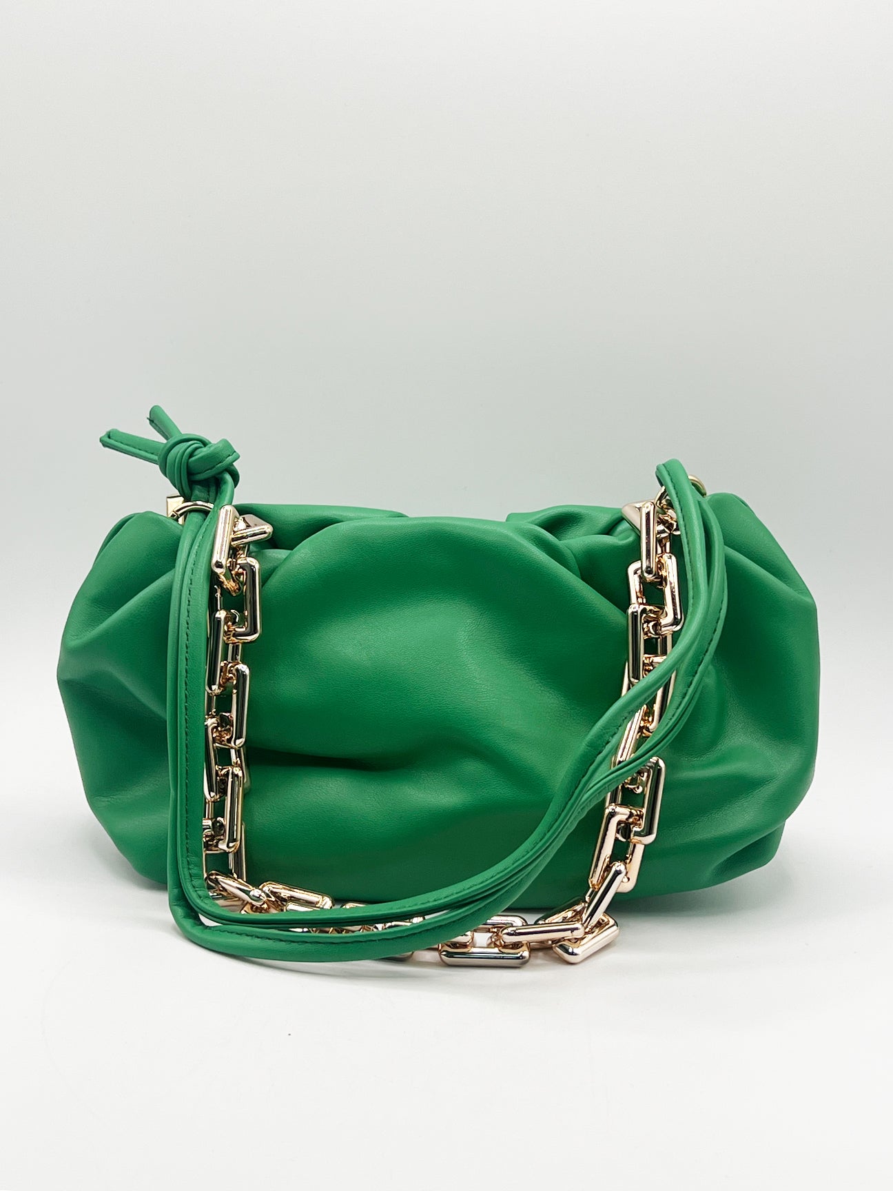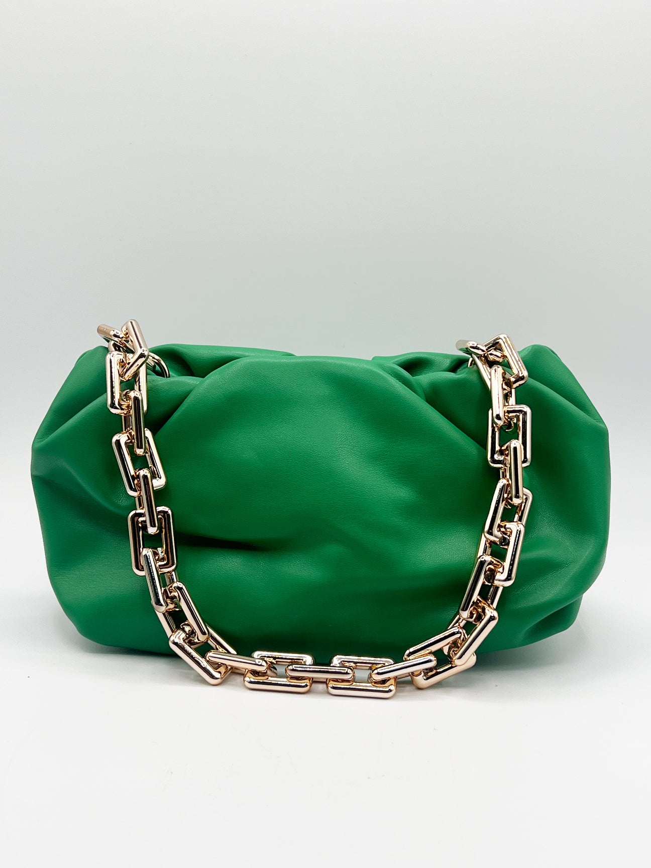 Pouch Bag in Green. Featuring a chunky chain strap and matte PU finish. This versatile piece can be styled as a clutch or worn as a shoulder bag, making it perfect for any occasion. H:14cm W:24cm D:10cm SKU:HB342317