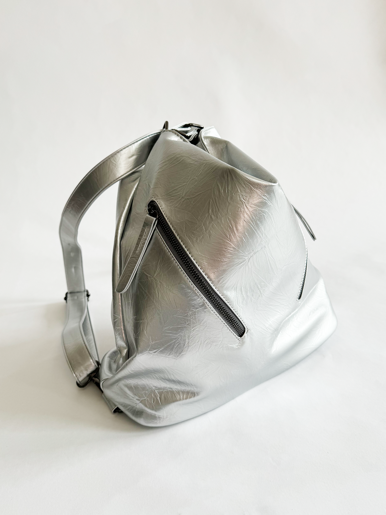 Introducing the Silver 2-in-1 Shoulder Bag and Backpack by SVNX. This versatile everyday essential seamlessly transitions between a chic shoulder bag and a practical backpack. Add a touch of metallic flair to any outfit with this must-have accessory.